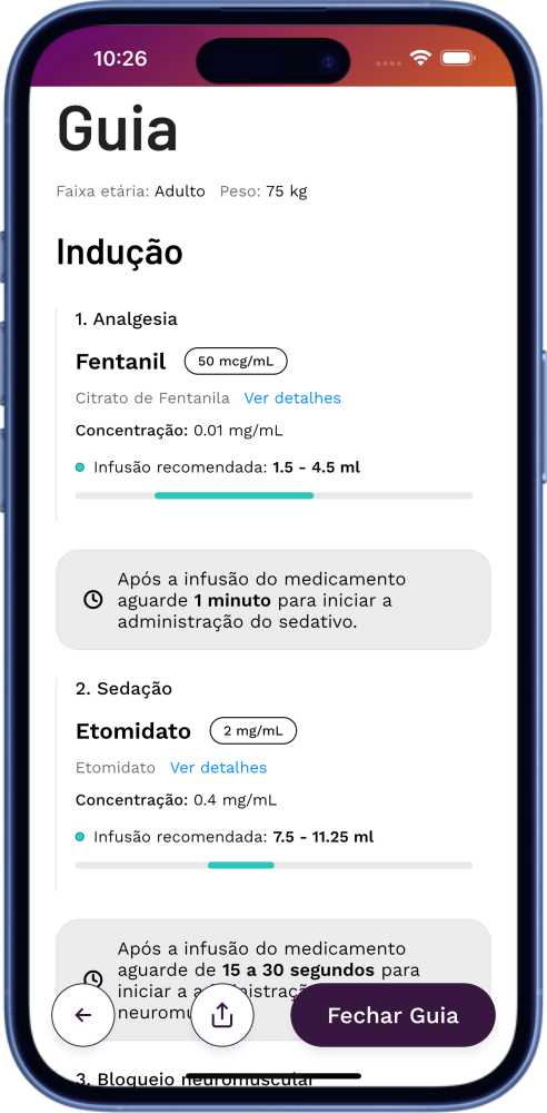 No final do processo, o aplicativo gera um resumo estruturado da conduta, reunindo os medicamentos a serem utilizados, as doses definidas, as velocidades de infusão quando aplicáveis e os materiais indicados para o procedimento. Esse documento pode ser salvo ou compartilhado diretamente com a equipe, favorecendo padronização, comunicação clara e maior segurança assistencial.